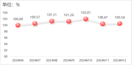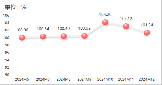 2024年12月,大米產物價錢指數小幅回升,指數值為100。54點,較上月增加0。07個百分點。具體運轉環境如下圖所示: