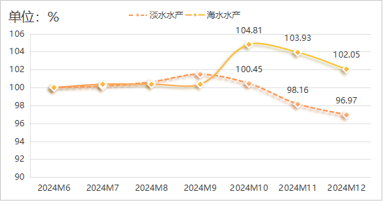 2024年12月,水產產物價錢指數再度回落,環比下降1。73%。具體運轉環境如下圖所示: