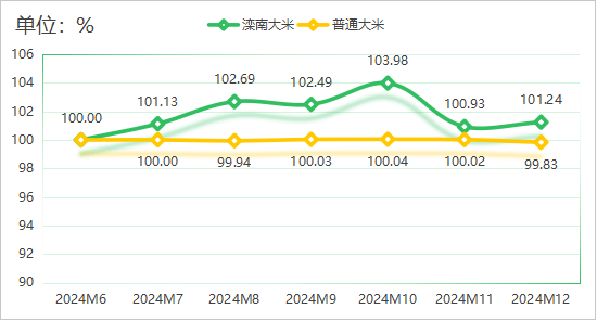 國際市場方面,結合國糧農組織(FAO)數據顯示,2024年12月份全球大米價錢指數環比下跌1。2%。大米次要出口國米價均有小幅下滑,截至2024年12月末,泰國5%破裂率大米FOB報價501美元/噸,越南5%破裂率大米FOB報價485美元/噸,巴基斯坦5%破裂率大米FOB報價452美元/噸,印度5%破裂率大米FOB報價449美元/噸。跟著印度盧比貶值至汗青低點,印度大米出口價錢進一步下跌,大米出口商的利潤被無效提高。相較于東南亞地域出口米價不竭下降,日本米價則再立異高,日本農林水產省數據顯示,2024年12月日本新米買賣價錢創下汗青新高,所有品種、用于從食的大米發賣給批發商的價錢是客歲同期的1。6倍,達每60公斤24665日元(約合人平易近幣1162元),每公斤大米折合人平易近幣價錢跨越19元。總體上看,國際大米到岸稅后價仍高于國內,中國農業消息網數據顯示,12月份,配額內1%關稅下泰國大米到岸稅后價每斤2。1元,比國內晚秈米批發價每斤高0。06元;離岸價折人平易近幣每斤1。8元,比國內低0。24元。進出口方面,我國大米進口量同比大幅下降,海關數據顯示,2024年全年,我國累計進口大米166萬噸,同比下降37。1%;累計進口額67。95億元,同比下降32。5%。大米出口同樣呈現下降趨向,海關數據顯示,2024年全年,我國累計出口大米111萬噸,同比下降30。8%;累計進口額45。22億元,同比下降28。2%。此中12月份,我國大米進口38萬噸,同比增加63。9%,進口額16。21億元,同比增加44。0%;大米出口5萬噸,同比下降73。9%,出口額1。97億元,同比下降75。4%。國內市場方面,12月份以來,南方地域中晚稻收購漸入尾聲,稻谷托市收購無力有序推進,對不變市場價錢闡揚了環節感化,中晚秈稻收購價維持平穩,粳稻大量上市,階段性供大于需,收購價穩中偏弱運轉。優良糧價錢仍較有劣勢,國度糧油消息核心數據顯示,2025年1月8日江西“黃華占”(優良稻谷)收購價2900元/噸,高于通俗中晚秈稻收購價310元/噸;湖南“黃華占”收購價2800元/噸,高于通俗中晚秈稻收購價180元/噸。分項產物價錢指數方面,灤南大米價錢指數回升,2024年12月指數上行至101。24點,環比增加0。31%。此中散拆灤南大米價錢指數維持正在103。50點平穩運轉;包拆灤南大米價錢指數有所回升,指數值為98。98點,環比增加0。64%。通俗大米價錢指數走弱,12月指數值為99。83點,此中秈米取粳米價錢指數均有小幅下滑,指數值別離為99。62點和100。31點。分項指數具體走勢見下圖: