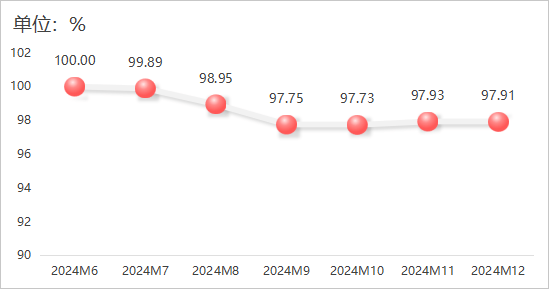 2024年12月,花出產品價錢指數維穩運轉,指數值為97。91點,較11月下降0。02個百分點。具體運轉環境如下圖所示: