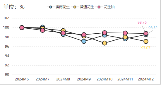 供給方面,2024/2025產季我國花出產量同比持平,疊加陳季花生結轉庫存,全體來看,花生根基面延續供需寬松款式。跟著春節假期臨近,農戶和經銷商出貨心理松動,農戶惜售情感有所緩解,產區供給總體優良,供強需弱特征仍然較著。跟著各購銷從體收購進入尾聲,節前市場很難構成買賣高峰,市場買賣量將逐步縮減。需求方面,市場需求仍然較弱。一方面市場決心遍及不腳,油脂期貨價錢遍及處于低位,采購商將連結擇價按需采購為從,市場價錢跟漲難度較大,但花生期貨目前價錢有所回升,后期市場決心預期改善。另一方面,近期油廠到貨平穩,但部門工場嚴控質量、限量收購,跟著春節到來,油廠將連續頒布發表停機、停收,貨源耗損渠道將會愈加單一,降低購銷兩邊的入市熱情。估計除夕后國內花生市場將維持區間盤桓行情,難以形成趨向性上漲。進出口方面,海關數據顯示,2024年12月,中國花生進口量37291。69噸,出口量18098。4噸,較11月有所下降。2024年中國全年花生累計進口759514。35噸,同比增加14。93%;全年花生累計出口144617。56噸,同比增加37。11%。同時本年度以來,國際花生現貨也呈現下跌趨向,目前價錢取2021年雷同,較歲首年月走弱500美元/噸擺布。從目前察看來看,美國、印度、阿根廷和巴西花生均實現減產,2025年國際花生估計價錢繼續承壓。分項產物價錢指數方面,三大分項指數呈現“一漲一平一跌”,此中灤南花生價錢指數呈現小幅回升,12月指數值為98。52點,環比增加0。91%;花生油價錢指數連結平穩運轉,指數值為98。76點;通俗花生價錢指數小幅下滑,12月指數值環比下降0。94%至97。07點。分項指數具體走勢見下圖: