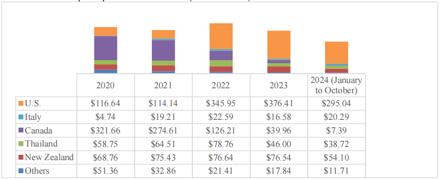 正在2023年,美國仍然是中國的最大出口國。美國寵物食物也是中國海關總署(GACC)新準入注冊和農業和農村事務部(MARA)新進口許可證的次要類別。新核準的進口許可證大部門用于烘焙和冷凍干燥寵物食物,這反映了中國消費者的需求趨向和對美國優良產物的偏好。按照中國海關的數據,2024年前10個月,HS編碼2309。10(零售的狗和貓食物)的進口寵物食物價值為4。2724億美元,取2023年同期比擬下降了17%。這一下降很可能是由于來自快速增加的中國國內寵物食物行業的合作加劇,以及疫情后的消費下降。