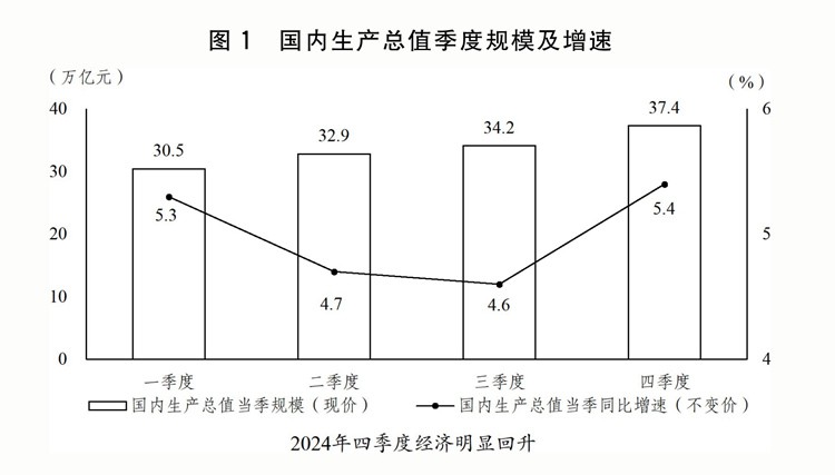 (一)因時因勢加強和立異宏不雅調控,鞭策經(jīng)濟回升向好。結實開展宏不雅政策逆周期調理,加大政策力度,政策效能,出格是9月26日地方局會議判斷擺設一攬子增量政策,市場預期、社會決心無效提振,四時度經(jīng)濟較著回升。全年國內出產總值(P)134。9萬億元、增加5%,此中,一、二、三財產別離增加3。5%、5。3%、5%。